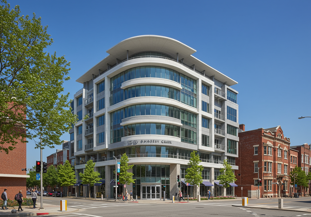 Circa Central Park is a modernist concrete building, with a curved facade facing a traffic circle.